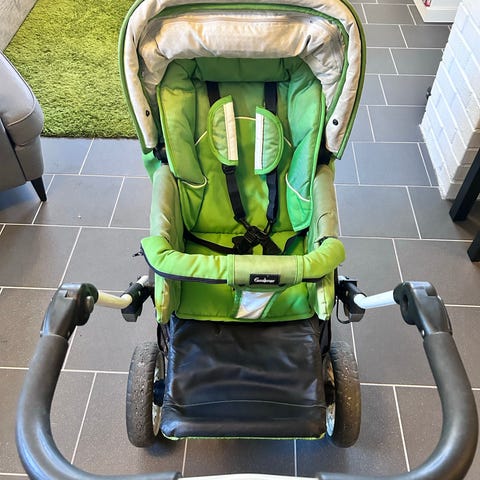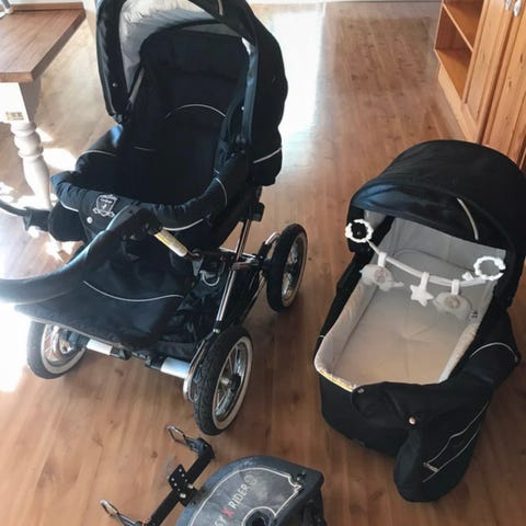 Hej. Säljer en fin svart Emmaljunga barnvagn. Vagnen har liggdel med vadderad insida och mönstrat innertyg. Stabilt chassi med fyra hjul och varukorg undertill. Liggdelens sufflett ger skydd mot väder och vind. Toppenvagn, väldigt sparsamt använd.