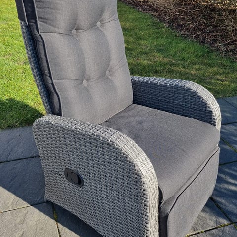 2 st fåtöljer med hög rygg i konstrotting tillsammans med matchande fotpall och bord. Båda delarna har grå sitt- och ryggdynor. Passar exempelvis på altan, balkong eller uterum som sittgrupp för avkoppling. Materialet är anpassat för utomhusbruk men kan även användas inomhus i exempelvis ett inglasat uterum.