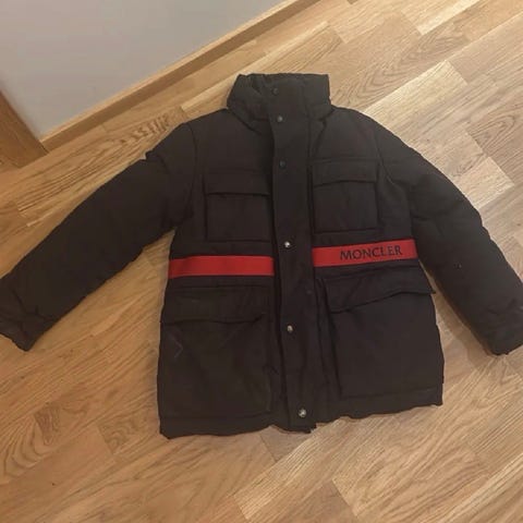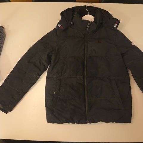 Mörkblå jacka från Tommy Hilfiger. Jackan har dragkedja, och fickor med knapp finns framtill. En huva finns i invikt i kragen. Märkets logga är broderad på bröstet, och sitter på en gummipatch på ena ärmen. På insidan finns ett tunnare foder. Kragens foder är rött och blått
