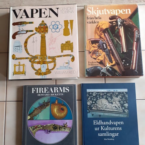 Auktionskatalog i bokform med fokus på vapen och militaria. Omslaget visar äldre gevär och pistoler, vilket indikerar innehåll om historiska skjutvapen, medaljer, dekorationer och antika militära föremål. Boken kan användas som referens för samlare eller den som är intresserad av vapenhistoria och militärhistoriska objekt.