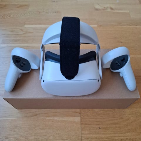Meta Quest 2 VR‑headset med tillhörande handkontroller i vit färg.