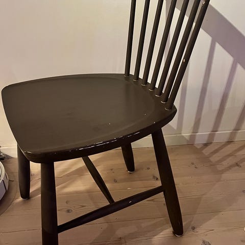 Stolab Carl Malmsten pinnstol i svartmålat trä. Klassisk pinnstolsmodell med formad träsits och rygg med flera pinnar. Passar som matstol i kök eller matrum, eller som extra sittplats i andra rum. Färgen är mörk och ytan visar trästruktur genom målningen.