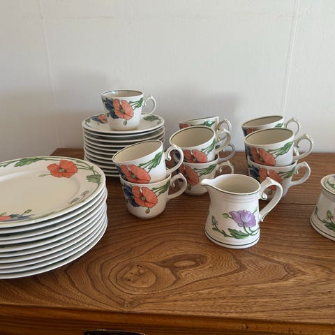 Kaffeservis från SCHERZER Bavaria Germany. Servisen inkluderar 10 fat och 10 koppar. Varje del är prydd med ett blommönster i rosa och grönt, samt en guldkant.