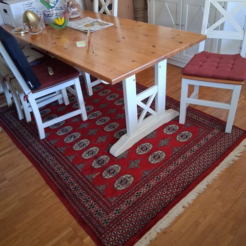 Bordet är 75 cm högt, 100 cm brett och 180 cm långt utan extraskivorna( 280 cm med extraskivorna).