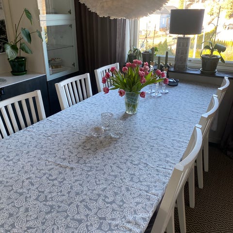Matbord i massiv ek från Mio med 8 stolar från ROOM.