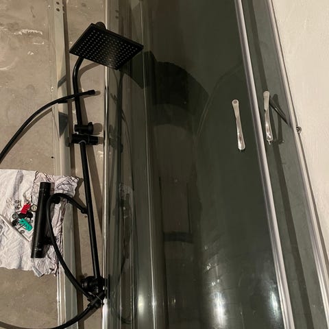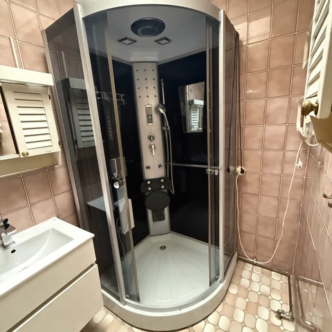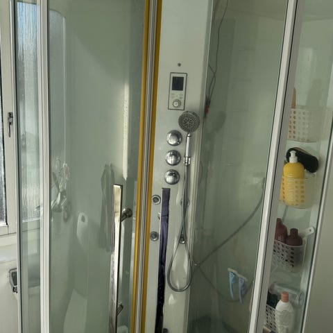 Duschkabin med ångfunktion och massage. Kabinen har en integrerad sittplats och flera munstycken för en avkopplande duschupplevelse. Den är utrustad med en handdusch och en hylla för förvaring av duschprodukter. Dörrarna är i glas och har en rundad design.allt funkar