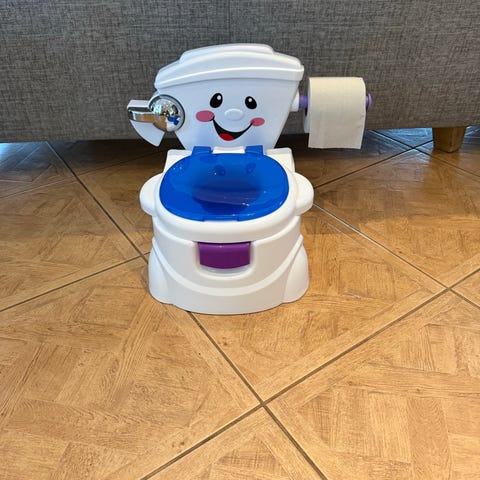 Barntoalett med stege i plast i vit och grön färg. Utrustad med handtag på sidorna, sits med ryggstöd samt två steg med halkskyddad yta. Anpassad för att placeras ovanpå en vanlig toalettstol för att underlätta toalettbesök för barn. Lämplig för inomhusbruk i badrum. Endast testad 1 gång