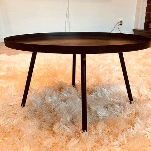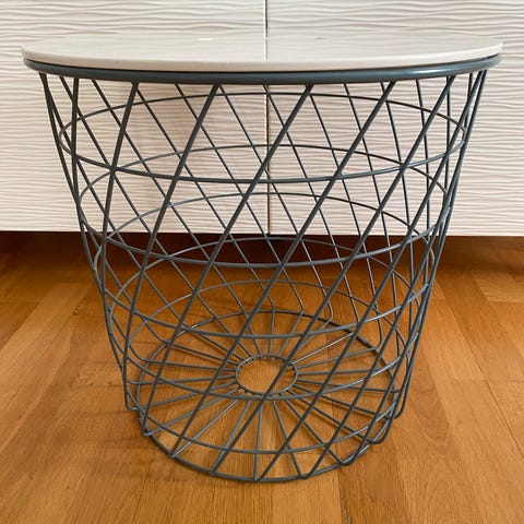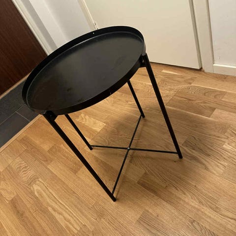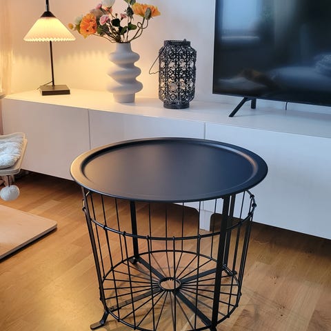 Soffbord eller sidobord i svart metall med avtagbar rund bricka upptill. Underredet består av en korgformad ställning med ribbor som ger möjlighet till förvaring av till exempel filtar eller tidningar. Bordet passar bredvid soffa eller fåtölj som avlastningsyta för exempelvis dryck, böcker eller dekorationer.