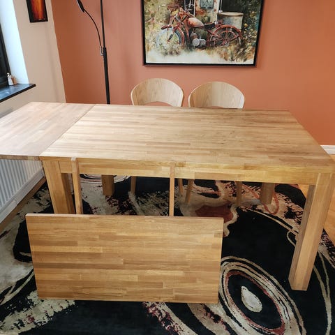 Runt matbord (tror IKEA) 115 cm i fint skick. Extra skiva 50 cm finns i/under bordsskivan. Tror träslaget är björk. Bordet finns ca 3 mil söder Linköping