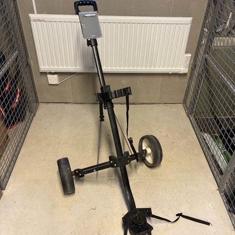 Hopfällbar golfvagn med två hjul i svart utförande. Vagnen har ställning för golfbag, rem för fastsättning samt handtag upptill. Konstruktionen är i metall med plastdetaljer på hjulen. Passar för transport av golfbag på golfbanan och kan fällas ihop för enklare förvaring och transport.