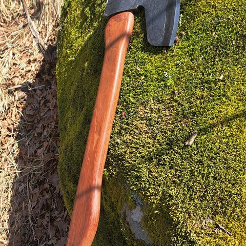 Yxa med långt träskaft och metallhuvud. Huvudet har en bred, rundad egg på ena sidan och en spets på den andra sidan. Skaftet är av trä med synligt slitage i färgen. Passar exempelvis som dekoration eller rekvisita. Exakta mått och tillverkningsår är okända.