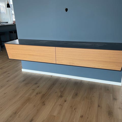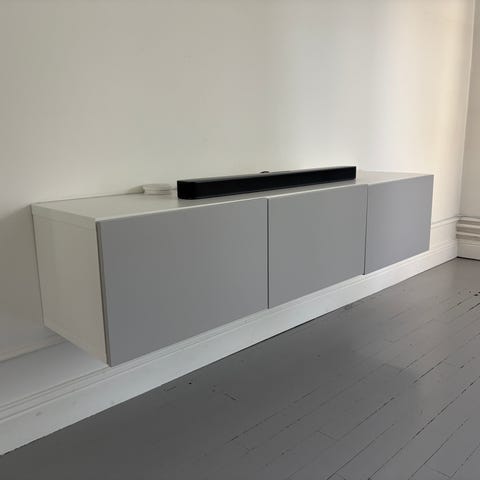 Säljer en vägghängd IKEA BESTÅ-bänk med luckor från Superfront (mörkblå). Stilren och stabil, funkar perfekt som TV-bänk eller förvaring.