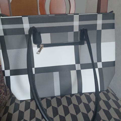 Ny Oanvända snygga stora VÄSKA, sienlook, vit/svart mönstrad och med dragkedja