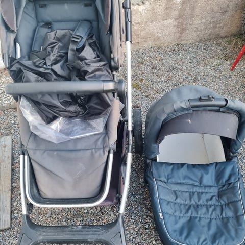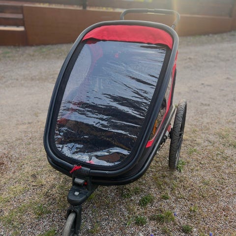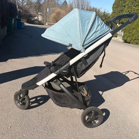Thule barnvagn i svart/grå färg. Vagnen har tre hjul, justerbart ryggstöd och sele för barnet. Utrustad med sufflett för sol- och vindskydd samt varukorg under sittdelen. Vi inkluderar Thule regnskydd/kåpa och en reflexkåpa i köpet.