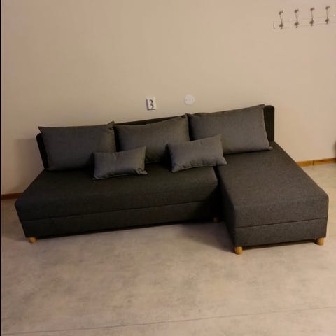Detta är en riktigt smidig soffa som enkelt görs om till en dubbelsäng när man får gäster. Dessutom finns det ett praktiskt förvaringsutrymme under schäslongen där man kan gömma undan täcken och kuddar.