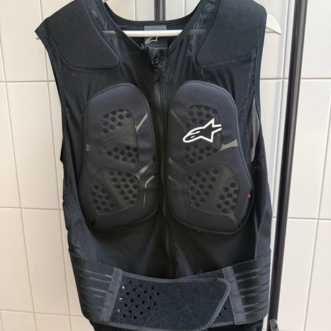 Alpinestar Track vest. Överkroppssskydd med inbyggd ryggplatta. Går att ha under jacka eller skinnställ. ( låtit lillen måla på den , se bild , syns dock inte under jackan)
