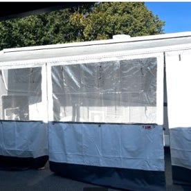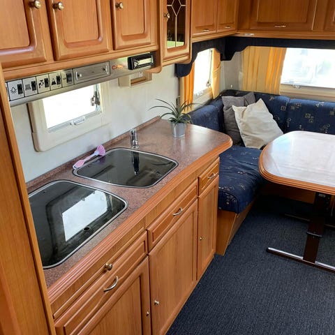 Den är komplett med två soffor (inkl fina dynor) som kan konverteras till dubbelsäng, förvaringsutrymmen och köksbänk med handfat, gasolspis och kyl.