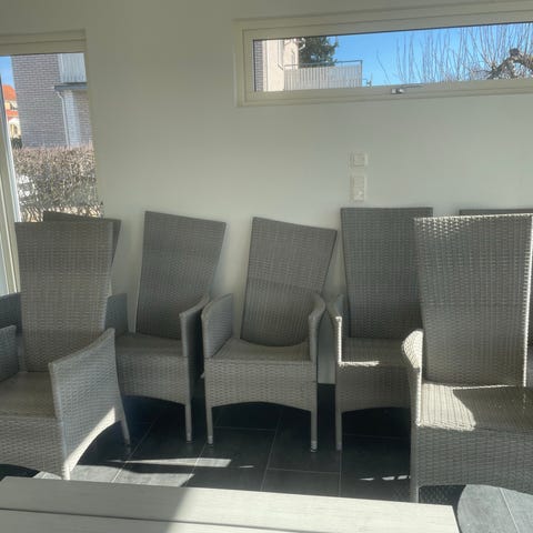 Trädgårdsgrupp med rektangulärt bord och flera stolar i trä. Möbelgruppen är brun och passar för uteplats, altan eller trädgård. Bordet har träribbor och stolarna har hög rygg och armstöd. Lämplig för utomhusbruk på plana underlag som trall eller stenlagd yta. Hillerstorp. Behöver tvättas o oljas in