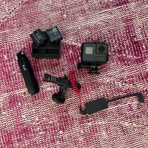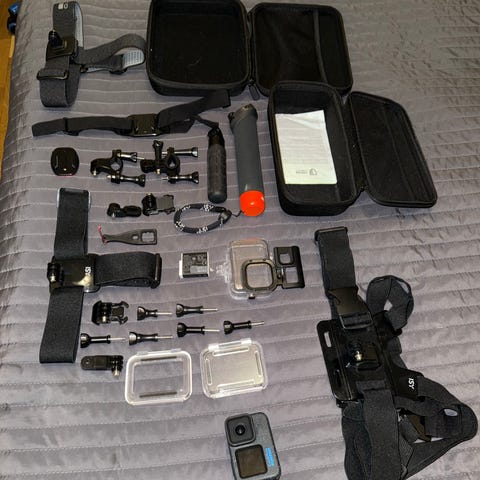 GoPro kameratillbehör kit med olika fästen och monteringsdetaljer. Kitet innehåller bland annat sele, sugproppsfäste, olika snabbfästen, skruvar, flytande handtag, teleskophandtag, småförvaring samt skyddsväska med formskuret inre. Tillbehören är avsedda för montering av GoPro actionkamera på exempelvis kropp, fordon och andra ytor, samt för transport och förvaring av kamera och tillbehör.