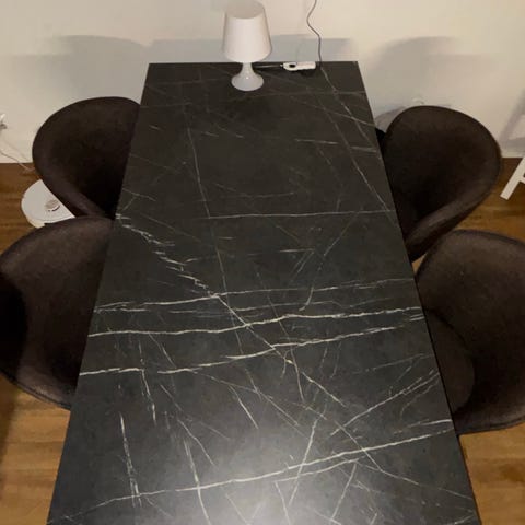 Ett matbord och 6 stolar i färgen svart/brunsvart.