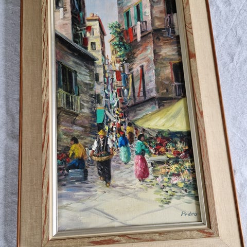 Osignerad oljemålning föreställande ett landskap med berg, dalgång, sjö och grönskande träd. Målningen är utförd på duk uppspänd på kilram och omgiven av en profilerad guldfärgad träram med dekorativt mönster. Baksidan visar träram och dukspänning. Passar som väggdekoration i vardagsrum, hall eller andra inomhusmiljöer där man vill ha ett klassiskt landskapsmotiv i olja.
