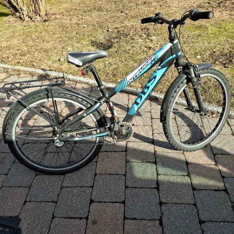 Barncykel med hjulstorlek 24 tum i orange färg. Utrustad med raka styren, handbromsar och sadel anpassad för barn. Passar för cykling på både väg och lättare grusunderlag. Lämplig för barn som vuxit ur mindre hjulstorlekar runt 20 tum.lite rost i kädja