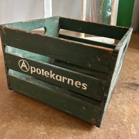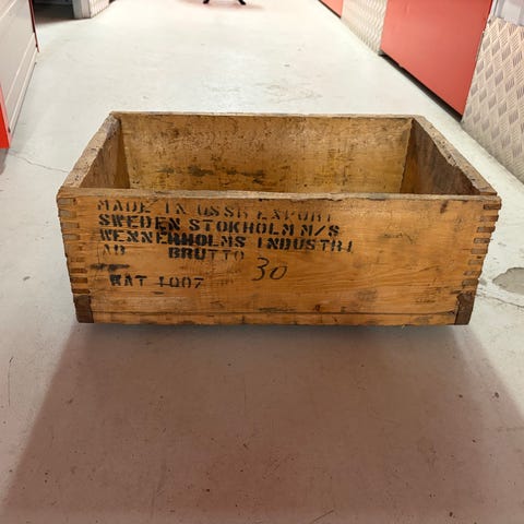 Stor trälåda i naturfärgat trä. Lådan är öppen upptill och har tryckt text på utsidan. Den står på en enkel träram som ger viss höjd från marken. Passar till förvaring, dekoration eller som odlingslåda i trädgård eller på uteplats. Mått och träslag är inte angivna.
