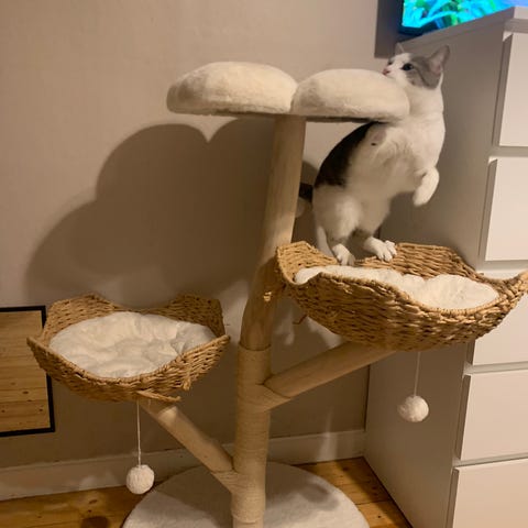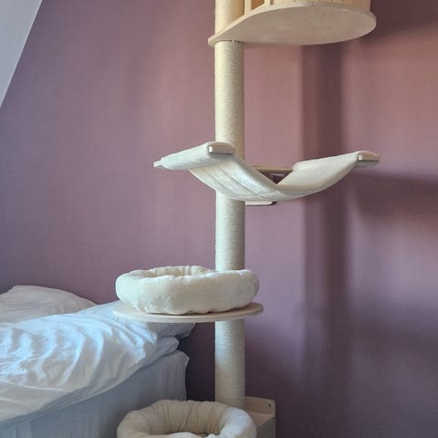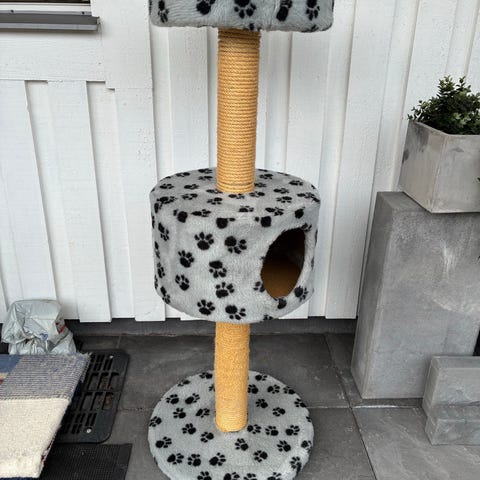 Klöstunnan innehåller 3 grottor med liggkuddar samt en mysbädd på toppen, alltså 4 våningar för lek och avkoppling. Det hänger lekbollar på alla grottöppningarna. Dessutom enorm klösyta. Flera katter kan få plats.