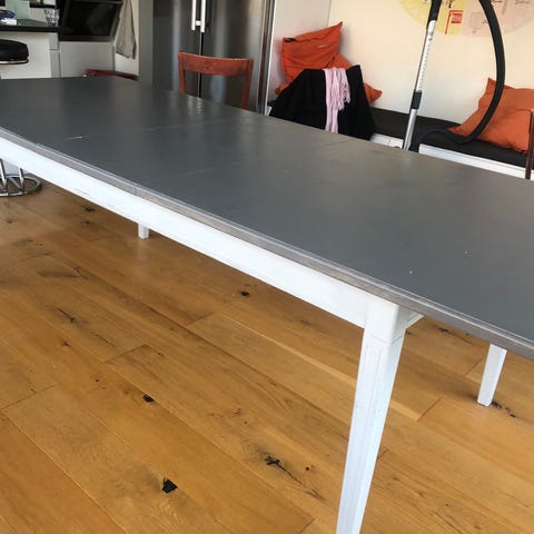 Avskavd färg på kanten på köksskivan och slitet vid benen där vår katt klöst. (Bilder finns). I övrigt i gott skick och en fint gediget bord som med lite färg blir som nytt igen.
