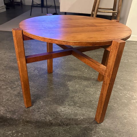 Runt soffbord i trä med iläggsskiva som går att höja och sänka upp/ner några cm vardera håll genom att snurra på bordsytan. I nuläget är höjden ca 63cm. Diameter ca 94cm. Är lite slitet i trät (se bilder)