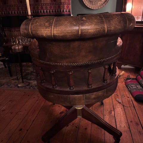 Engelskt Skrivbord och Chesterfield kontorsstol i brunt läder och trä