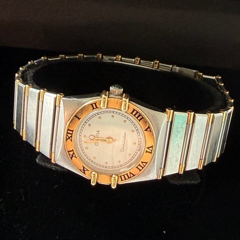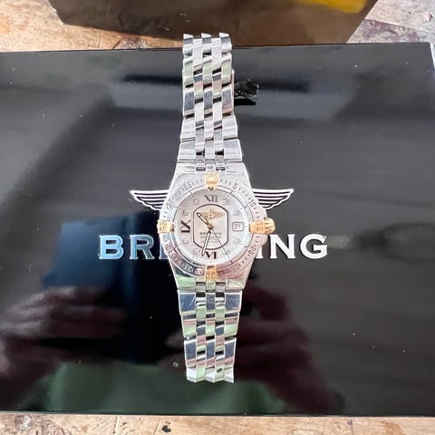 Breitling J-Class 31mm, Stål/Gold, armbandsur med tvåtonad metallänk i stål och guldf detaljer. Boetten har guldfärgad bezel och mörk urtavla med indexmarkeringar och datumfönster. Klockan är utformad som ett klassiskt analogt armbandsur , mycket fint skick och fint dam klocka, nytt batteri.