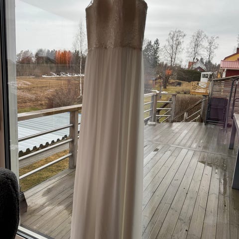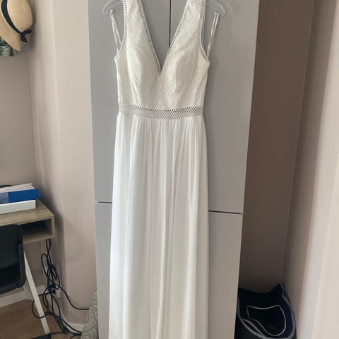 Vit långklänning för dam i storlek 36. Klänningen är ärmlös med djup V-ringning framtill och verkar ha en rak, fallande passform nedtill. Längden går ned till golvet, vilket gör den lämplig som exempelvis fest- eller högtidsklänning. Märke och material är okänt utifrån tillgänglig information.
