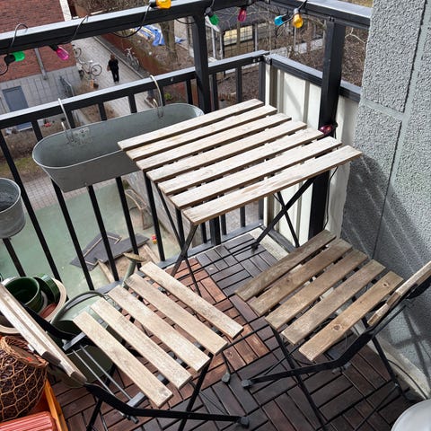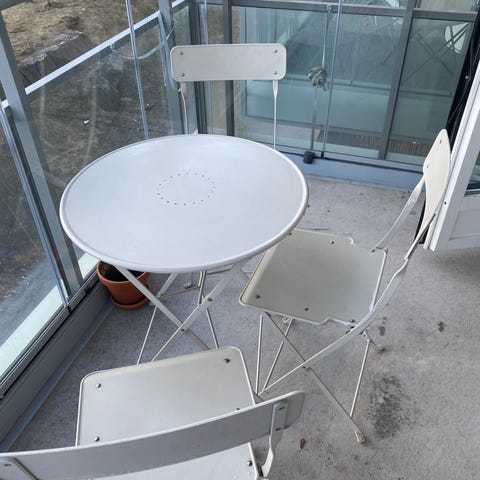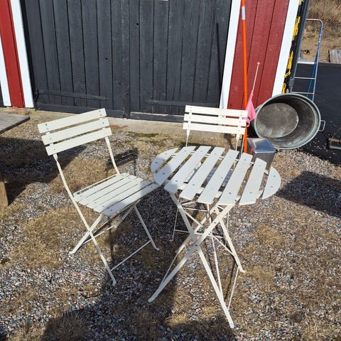 Cafémöbelset bestående av ett runt bord och två stolar. Möbeln är utförd i vitmålad metallstomme med sits, rygg och bordsskiva i vitmålat trä med ribbor. Passar för mindre uteplatser, balkong eller altan. Bord och stolar är hopfällbara för enklare förvaring när de inte används.