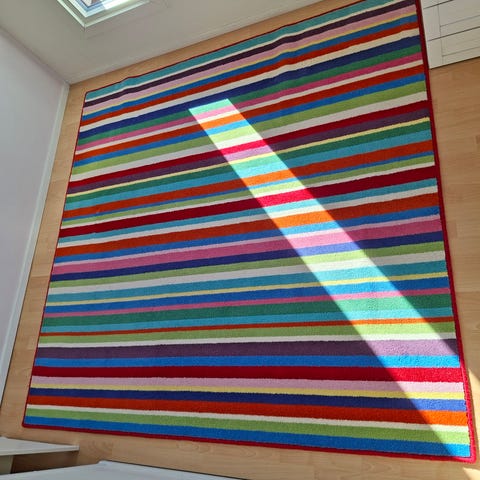 Rusta matta i ljus färg med diskret geometriskt mönster. Finns lite fläckar på den men kan kemtvättas.