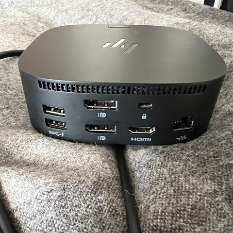 HP dockningsstation adapter i svart utförande. Enheten ansluts till datorn via fast kabel och erbjuder flera anslutningar, bland annat USB-portar, DisplayPort, HDMI och nätverksport (RJ45). På framsidan finns hörlursuttag och ytterligare USB-portar. Passar för anslutning av externa skärmar, kringutrustning och nätverk till kompatibla HP-datorer och andra enheter som stödjer denna typ av dockningslösning.