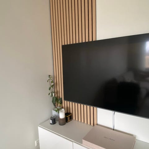 Akustikpanel med trälameller för väggmontering. Panelen har måtten 2420 x 520 mm. Tjocklek på panelen är 18 mm, varje lamell har en bredd på 25 mm och mellanrummet mellan lamellerna är 16 mm.