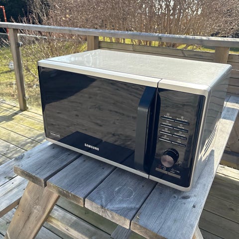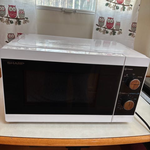 Sharp mikrovågsugn i vit färg. Modellen har frontlucka med glasfönster och två manuella vred på sidan för inställning av effekt och tid. Passar för uppvärmning och enklare tillagning av mat i kök, studentbostad eller kontor. Strömkabel ansluts till vanligt vägguttag. Använd 5 ggr