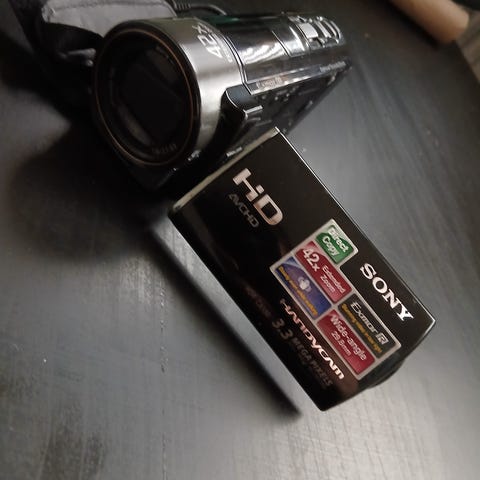 Sony Handycam Vision videokamera för Hi8-band i silverfärg. Kameran har vikbar LCD-skärm, sökare och inbyggda reglage på sidan för uppspelning och inspelning. På kamerahuset anges 560x digital zoom. Passar för inspelning och uppspelning av Hi8-videokassetter. På bilderna syns även en väska som kan användas för förvaring och transport av kameran.