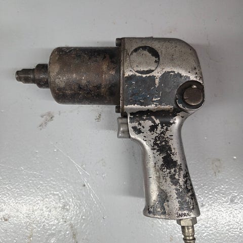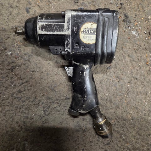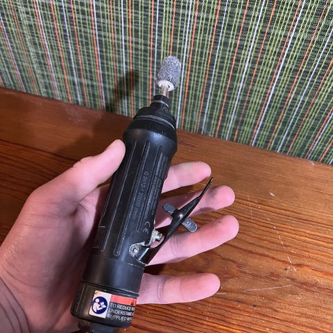 Pneumatisk rak slipmaskin med ansluten luftslang. Verktyget har avlångt handtag med manöverspak och slipdel framtill för montering av slipstift eller liknande tillbehör. Avsedd för slipning, gradning och liknande precisionsarbeten i verkstadsmiljö med tryckluft som drivkälla.