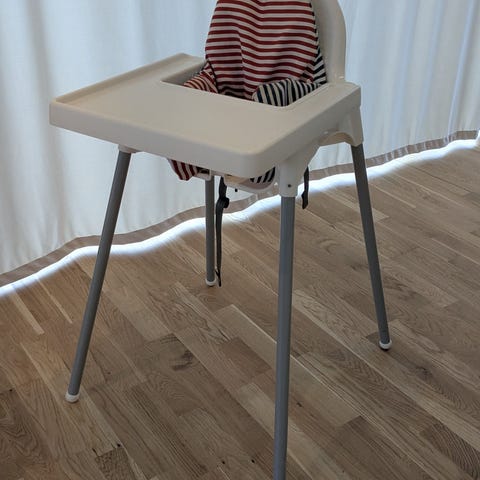 IKEA ANTILOP barnstol (röd/silver) med säkerhetsbälte, bricka och stolsdyna