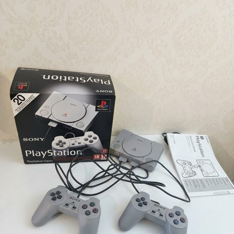 Sony Playstation spelkonsol grå med handkontroller och spel
