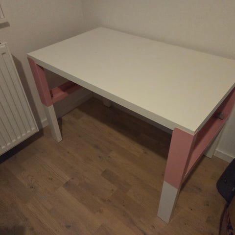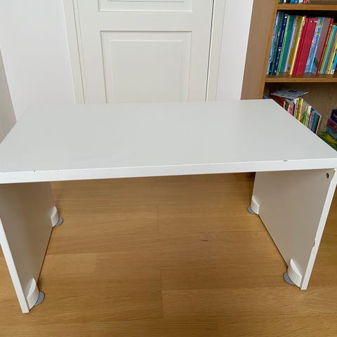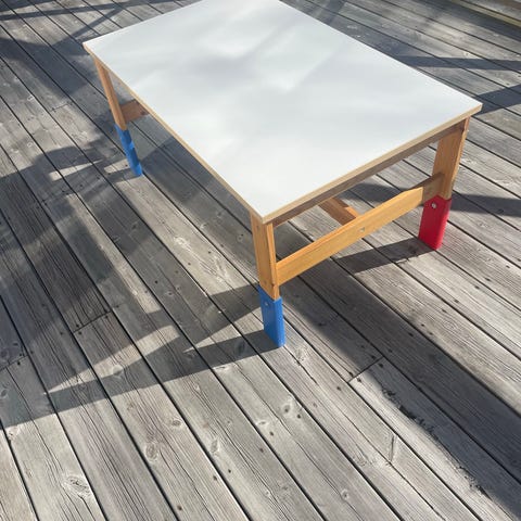 Säljer IKEA barnbord med vit bordsskiva och stomme i trä. Bordet har ben med färgade nederdelar i rött och blått. Passar som pysselbord, lekbord eller mindre skrivbord i barnrum eller lekhörna. De färgade skivorna är monterade själv då dom är till för att kunna höja bordet om det är för lågt. De går att ta bort dom lätt med en skruvmejsel.