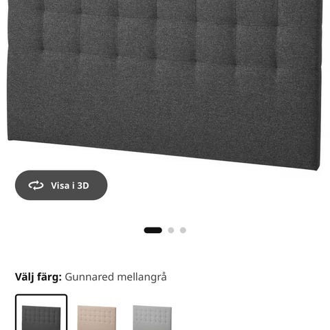 IKEA sänggavel i grått tyg som passar till en 180 säng. Rak, stoppad modell som placeras bakom sängen mot väggen. Passar som komplement till säng och madrass för att ge stöd bakom kuddar och skydda väggen. Färg och material framgår av bilderna, exakta mått och modellnamn är inte angivna.