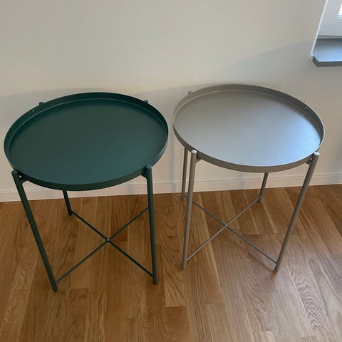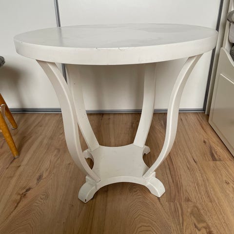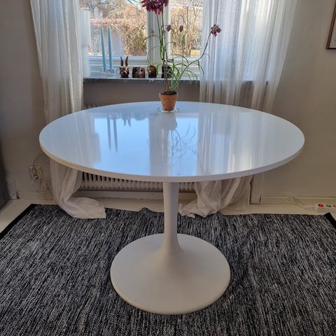 runt bord med vit bordsskiva och svarta ben. Bordet har en enkel, funktionell design med fyra ben och rund skiva, lämpligt som soffbord eller mindre matbord beroende på mått och behov. Passar i vardagsrum, kök eller mindre utrymmen där ett kompakt bord önskas.