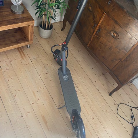 Svart elsparkcykel med ståplatta och styre i helsvart utförande. Utrustad med fram- och bakhjul med helgjutna däck, framlampa samt bakre positionsljus/bromsljus. Hopfällbar konstruktion för enklare förvaring och transport. Passar för kortare pendlingssträckor eller fritidskörning på hårda underlag. Exakta tekniska specifikationer som räckvidd, motoreffekt och batterikapacitet framgår inte av bilderna.
