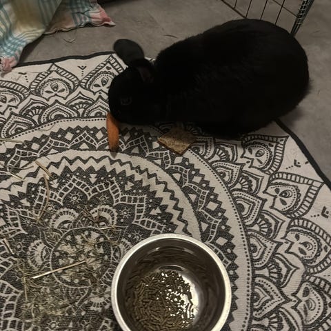 Hon är av färgen Svart Wienertecknad och är rex bärare och nu när kullen kom så fick vi även veta att hon bär på Chinchilla. Hon kan flytta som antingen avels kanin eller sällskap😊