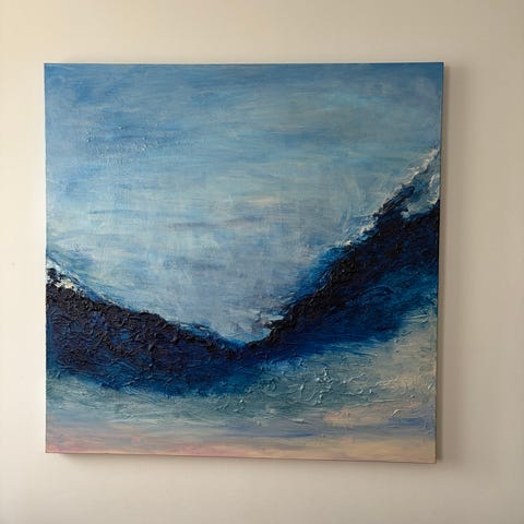 Flera abstrakta tavlor i blå och gröna nyanser. Finns nära Ekerö centrum en kvart från Brommaplan. Säljes av konstnären. Jag väljer en ny riktning med min konst och säljer därför ut dessa målningar till lågt pris. Endast 2500:- styck. Kom och titta!