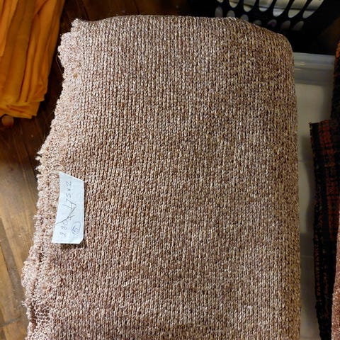 Ett mörkare brunt tygstycke med en texturerad yta. Tyget har en blandning av bruna och vita trådar som ger det ett unikt utseende. Brunt tyg med vita inslag, vilket ger det en fläckig eller spräcklig textur. Tyget är grovt väv. Icke stretch. Grovt