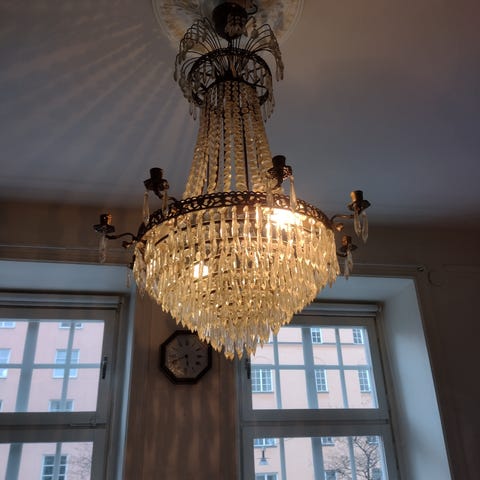 Fin antik taklampa med kristaller. Diameter 34 cm. Fem glödlampor.